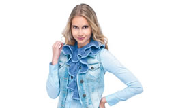 Delores, this beautiful scarf by Susie Johns, features unusual ruffles and elegant cord ties. It's perfect for wearing indoors over a sweater or can be used to soften the neckline of a jacket or coat whilst keeping you snuggly at the same time. The frilled effect is produced by rows of regular increases to create a fluted effect, incorporating a few rows of eyelet lace and then finished with a narrow border in a contrasting colour. The ties are finished with cone-shaped spiral end pieces in the same lacy pattern.