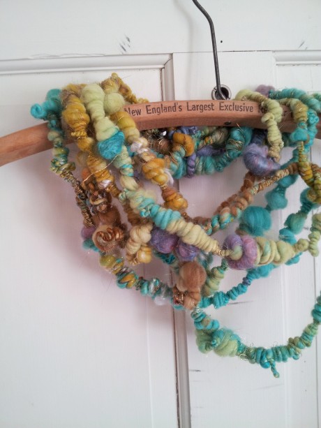 One day while I was looking for bulky yarn on the cheap, I came across Lexi Boeger’s website, Pluckyfluff, and her yarns took my breath away. I was hooked and knew I needed to begin spinning my own art yarns for knitting on my giant needles. I didn’t want to create perfectly even, traditional yarns because that’s not what I wanted to knit. I wanted to create with art yarn.