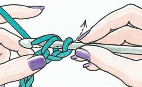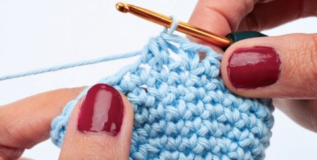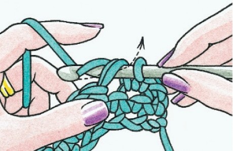 1. Insert the tip of the crochet hook under ht two loops of the next stitch and catch the ball end of yarn. Draw the arn through the loops so that there are now two stitches on the hook