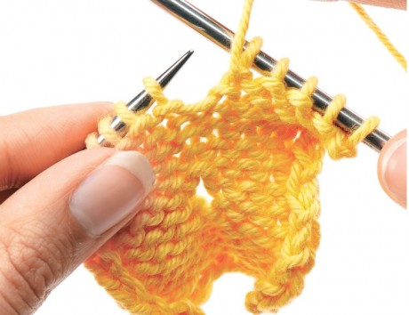 This is worked between two knit stitches. The yarn starts at the back of the work.