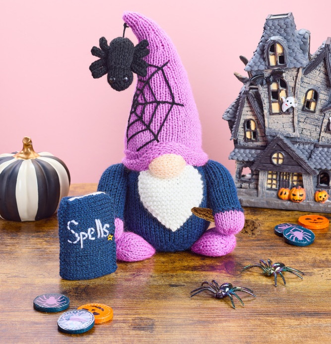 This Halloween wizard gonk is just as fun to knit as his bewitching partner. With his flowing beard and magical details, he looks like he’s just stepped out of a knitting version of Hogwarts. We especially love the embroidered cobweb and dangling spider.