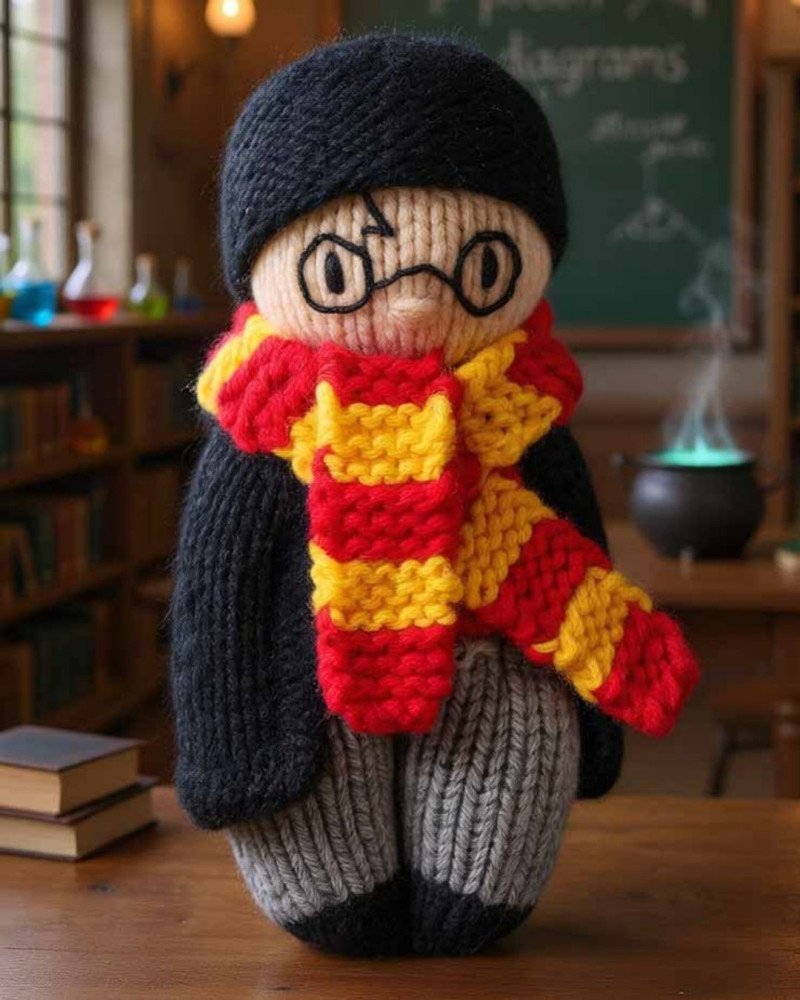 Perfect for beginners and stitched with DK yarn, this little magic-maker is sure to steal hearts faster than a Golden Snitch. Featuring embroidered round specs, a flowing cloak, and that iconic lightning-shaped scar, it’s a nod to the Boy Who Lived. Even better, this doll comes with a detachable stripy scarf — simply switch up the colours to pledge loyalty to your favourite house.