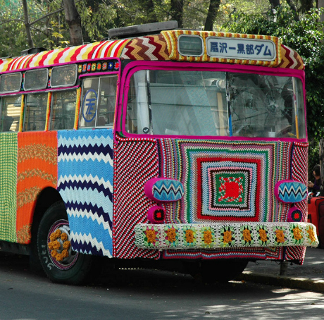 Artist Magda Sayeg used her craft skills to cover an entire bus in Mexico City.