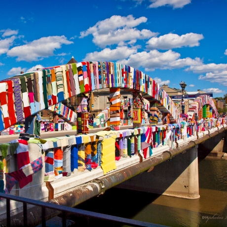 The KNIT CamBRIDGE project was the brainchild of Sue Sturdy, a fibre artist from Cambridge, Ontario, Canada. It was designed to highlight Ontario’s textile production history. The knitted strips were attached to the bridge with 16,000 zip ties and over 1,000 knitters from around the world contributed. Image via DHPhotos.
