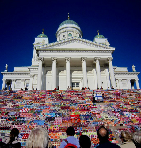 In an attempt to break the Guinness World Record for the largest crocheted patchwork quilt in the world, 7,000 blankets were laid out on the steps of Helsinki Cathedral in Finland.