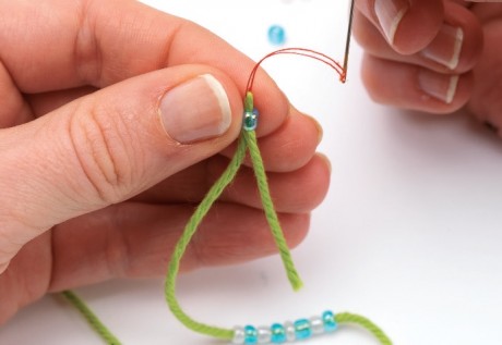 2. Slide your bead on to the sewing needle then push it down over the loop and on to the yarn.