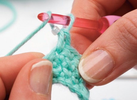 TOP TIP: It’s essential to use a crochet hook that will fit through the hole in the bead – we recommend 0.6mm. The hole must also be big enough for a double thickness of your yarn.
