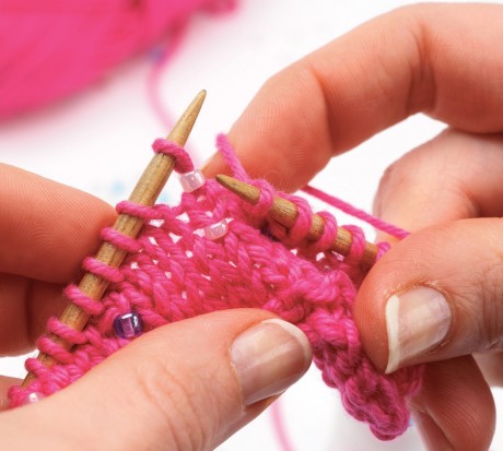 On a wrong-side row: This uses the same method as on a knit row. Purl to where the bead is required, take the yarn backwards and slip the next stitch purlwise. Move the bead up then bring the yarn firmly forward, purling the next stitch as normal.