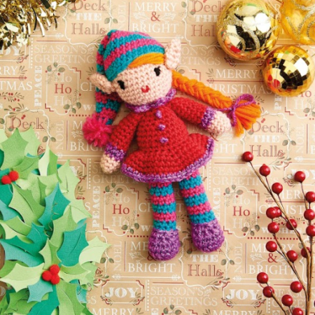 Whether she’s sitting on a shelf or busy helping Santa get ready for Christmas, Florence the Elf is sure to be wearing her finest sparkly collar, stripy tights and matching hat! Sarah-Jane Hicks has designed her using simple stitches so she’s suitable for confident beginners.