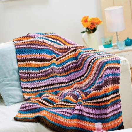 Here at LKt we like to encourage people to step outside the box when it comes to getting creative. Purple, orange, brown and teal probably wouldn't have been your first choice colour combo, but they go perfectly in this fabulous irregular striped blanket! The stitch pattern is made up of clusters of treble crochets and adds texture to this striking design.