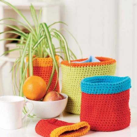 Use simple crochet stitches to make super colourful and useful baskets for your home, or for your yarn! These are working in a washable cotton yarn but you can use your stash of aran yarn to make your own colour combinations.
