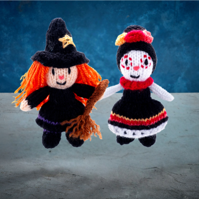 Here come the girls! The next two housemates have arrived and the Witch has brought her broom (ready to hand over to the Vampire so he can do the sweeping). We love the details on these two dolls, from the star on the Witch’s hat to the beautiful flowers on our Day of the Dead Person. Only small amounts of yarn are needed for the embellishments, so see what’s in your yarn stash. Download the pattern to continue your Halloween knits.