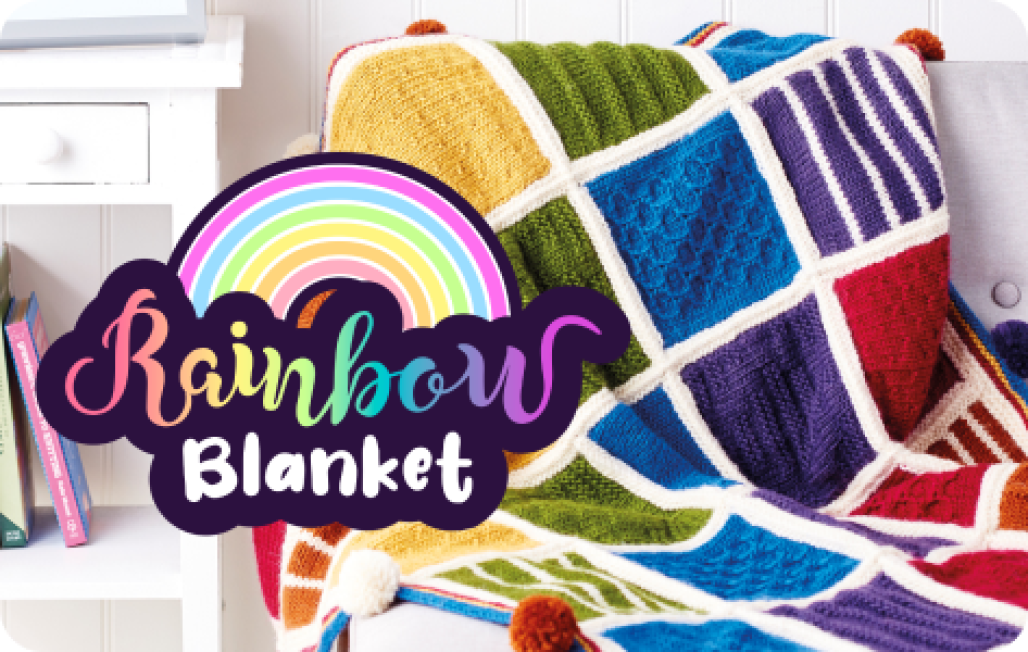 Lynne Rowe’s chunky blanket is a riot of texture and colour, with seven shades and six different square designs combined in one bold and beautiful piece.